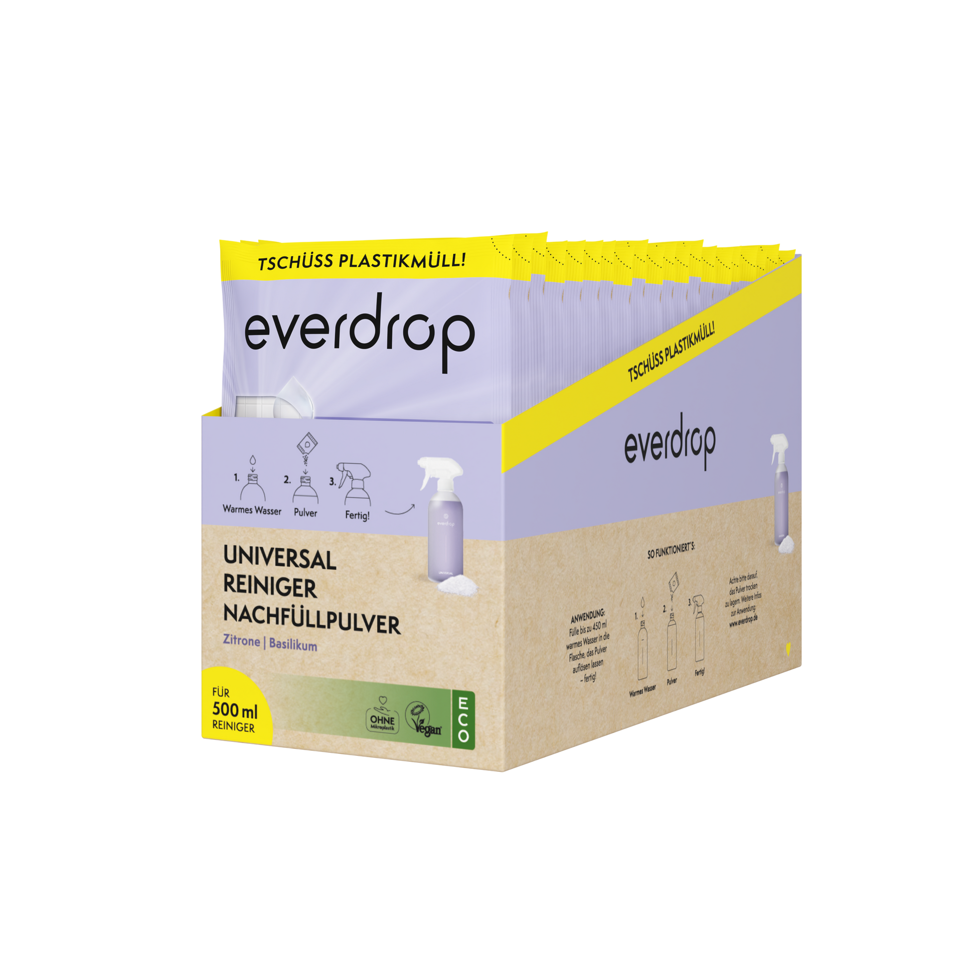 Das everdrop Universalreiniger Starter-Set ist der Allrounder gegen hartnäckigen Schmutz im gesamten Zuhause. Dabei schont der Reiniger dank Multi-Aktiv Formel nicht nur die Oberflächen, sondern ist auch noch 100 % lebensmittelsicher und damit auch auf allen Flächen in der Küche anwendbar. Die Flasche lässt sich zudem immer wieder nachfüllen und spart so Unmengen an Einwegplastik ein. Kurzum: Ein Multi-Talent beim Putzen und beim Umweltschutz!